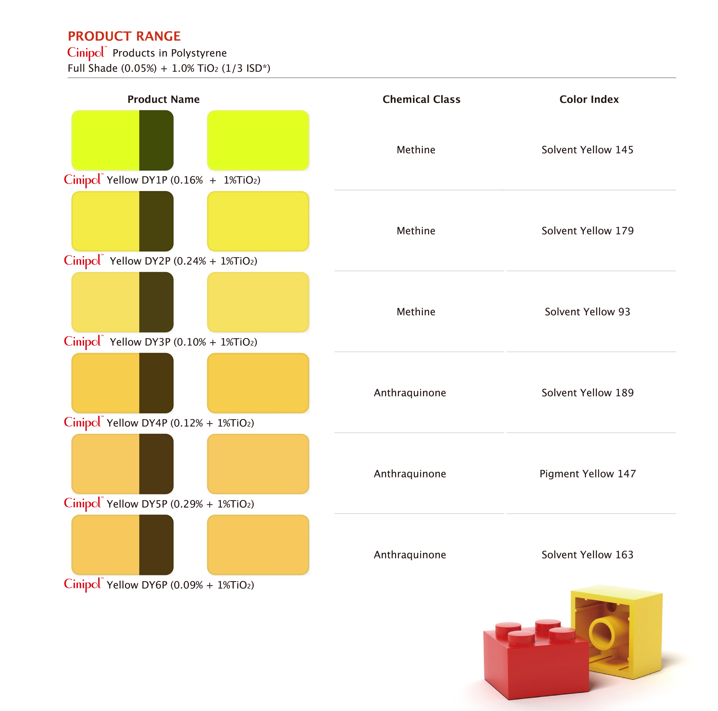 先珀®(Cinipol®)系列為高性能聚合物可溶性顏料。具有高純度,高耐溫,顏色艷麗等特點(diǎn)。廣泛適用于聚對(duì)苯二甲酸乙二醇酯(PET)、聚碳酸酯(PC)、聚甲基丙烯酸甲酯(PMMA)、丙烯腈-丁二烯-苯乙烯(ABS)、尼龍(PA)等多種工程塑料體系及聚酯纖維(PES)的著色。該系列優(yōu)異的溶解性和耐溫性使產(chǎn)品在工程塑料/合成纖維加工過程中易于分散使用,并可滿足各類制品戶內(nèi)外的耐光/耐候使用要求。本系列產(chǎn)品亦可用于需要與食品直接接觸的塑料包裝制品中。